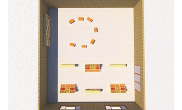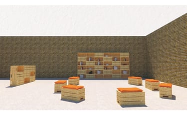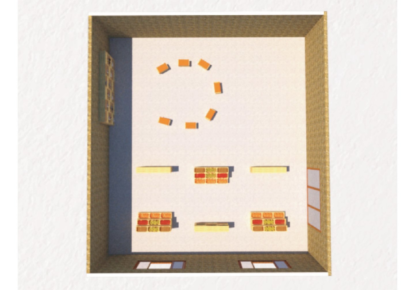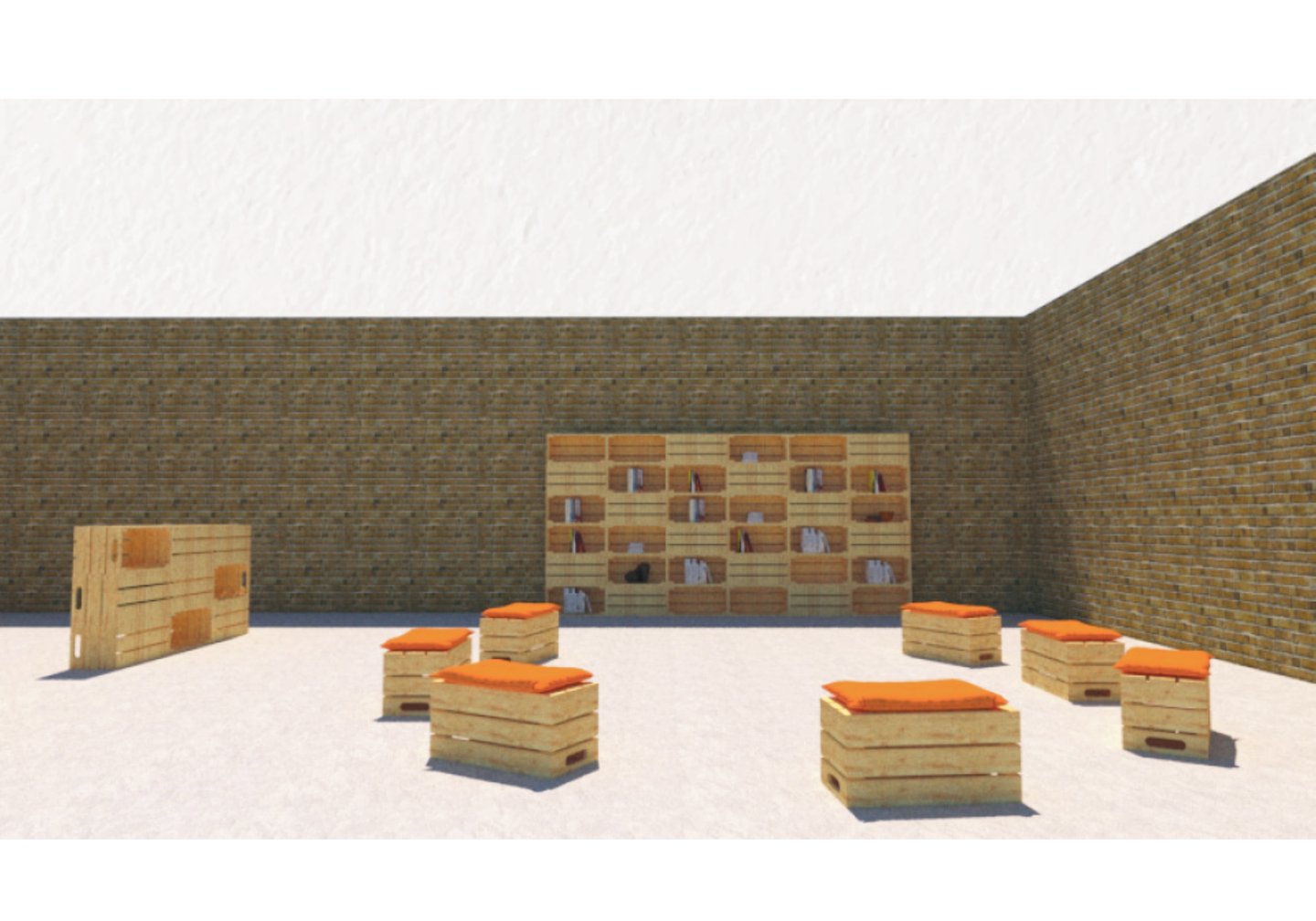 Será o espaço destinado ao treinamento e compartilhamento de informações. A composição dele foi feita de maneira simples possibilitando várias configurações. Foram colocados bancos para as pessoas sentarem e uma estante para servir de apoio a livros e outros materiais de estudo. É um dos espaços centrais do projeto, onde ocorrerão todas as atividades de aprendizagem.